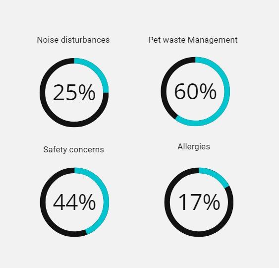 In contrast, indifference toward community pets is prevalent in places like Chennai, although resident-owned pets spark high emotions and divisions. Our survey revealed that 77% of gated communities experience conflicts between pet owners and non-pet owners. Common issues include noise disturbances (25%), pet waste management (60%), safety concerns (44%), and allergies (17%).
