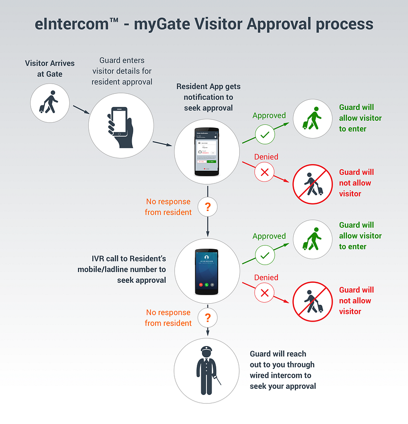 In case the residents do not respond to the message, or if the resident has poor or no internet connectivity or has not downloaded Mygate app, Mygate servers will generate an automated IVR ( Interactive voice response) call to designated number ( a primary and a secondary landline or mobile number) which is provided by the residents, in order to seek their approval. If the resident does not respond to any of the above steps, as the last resort the guard tries to reach out to the resident via the wired intercom.
