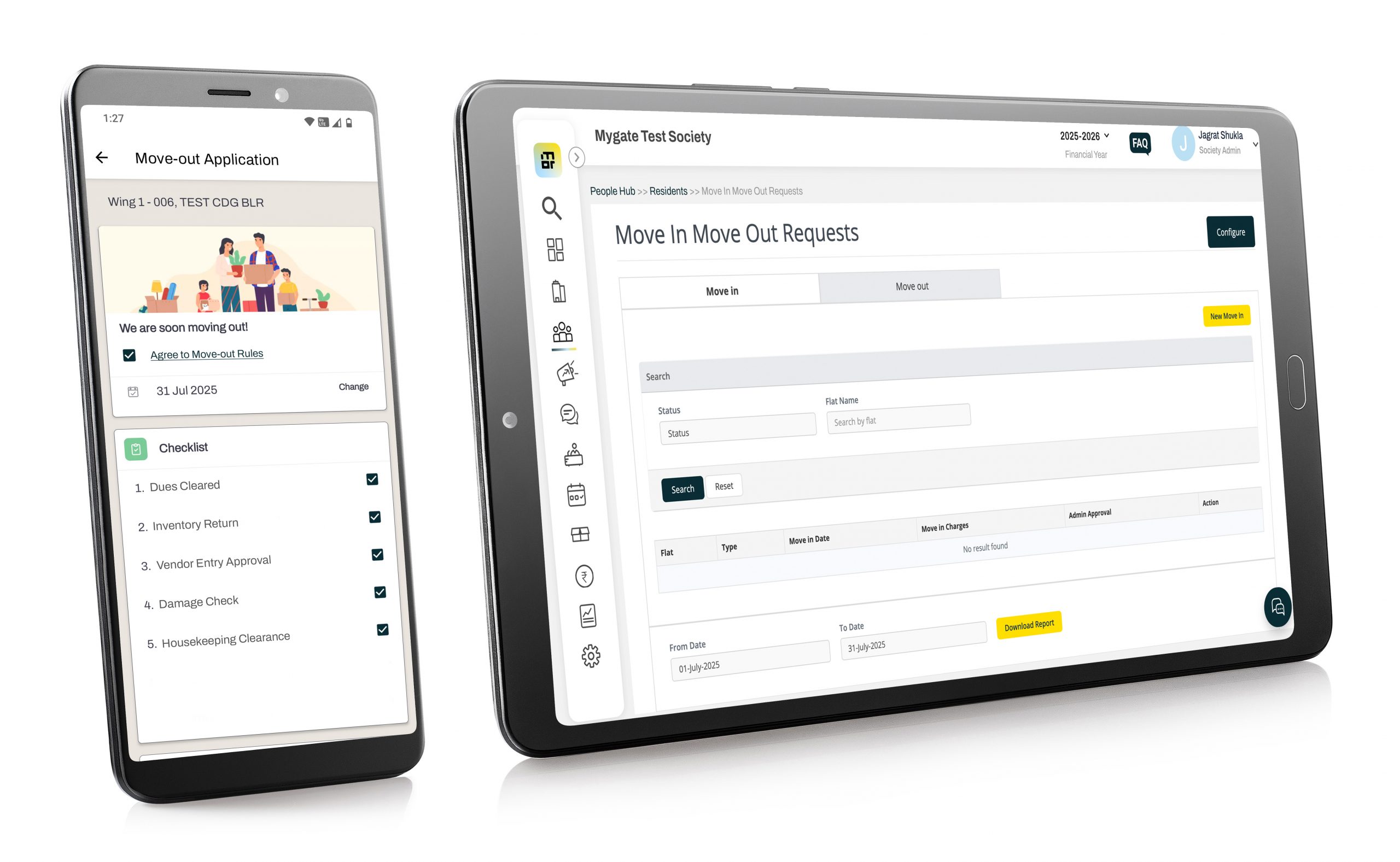 Yes. Residents can initiate a Move-out request directly from the Mygate app. Once submitted, the management committee receives a notification to review and approve the request. Upon approval, the resident’s account is deactivated, and society records are updated accordingly.